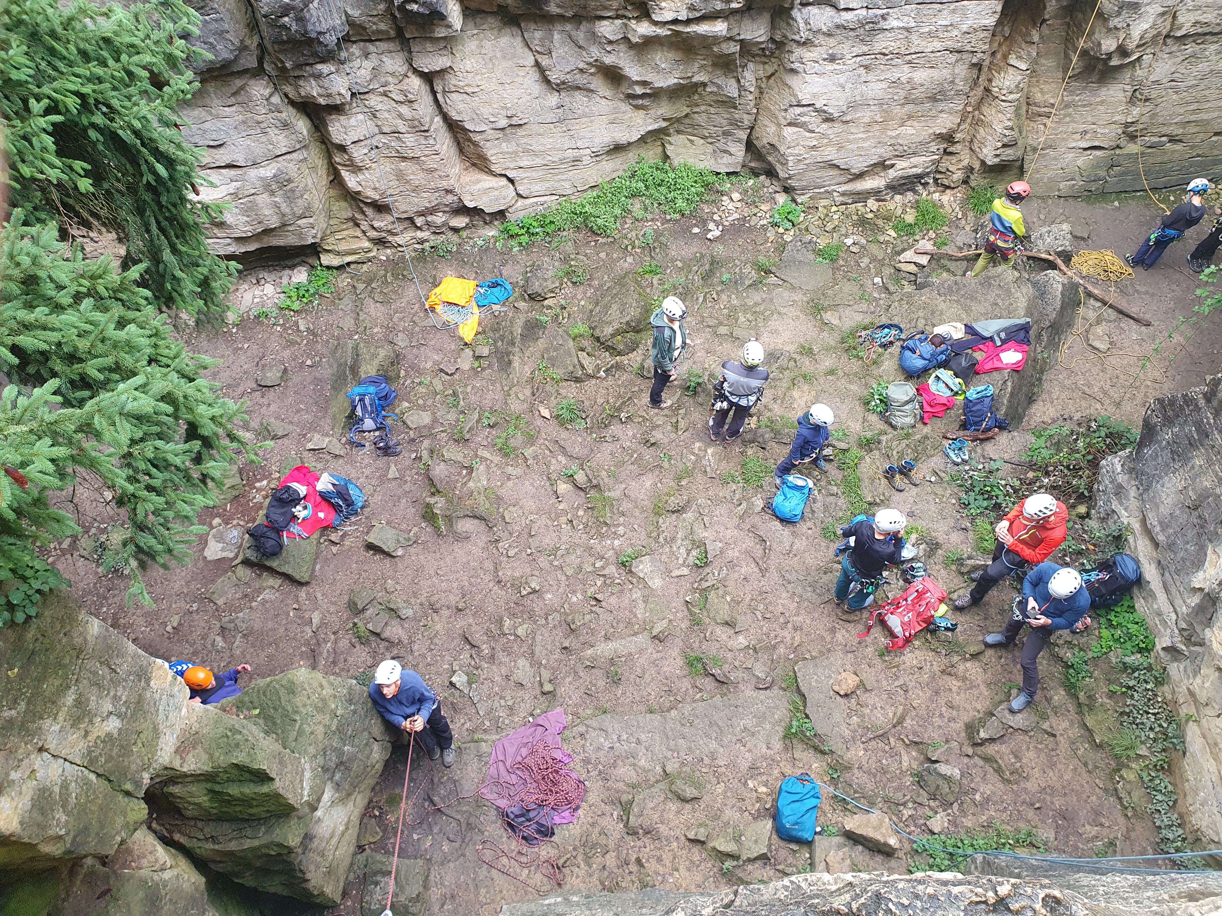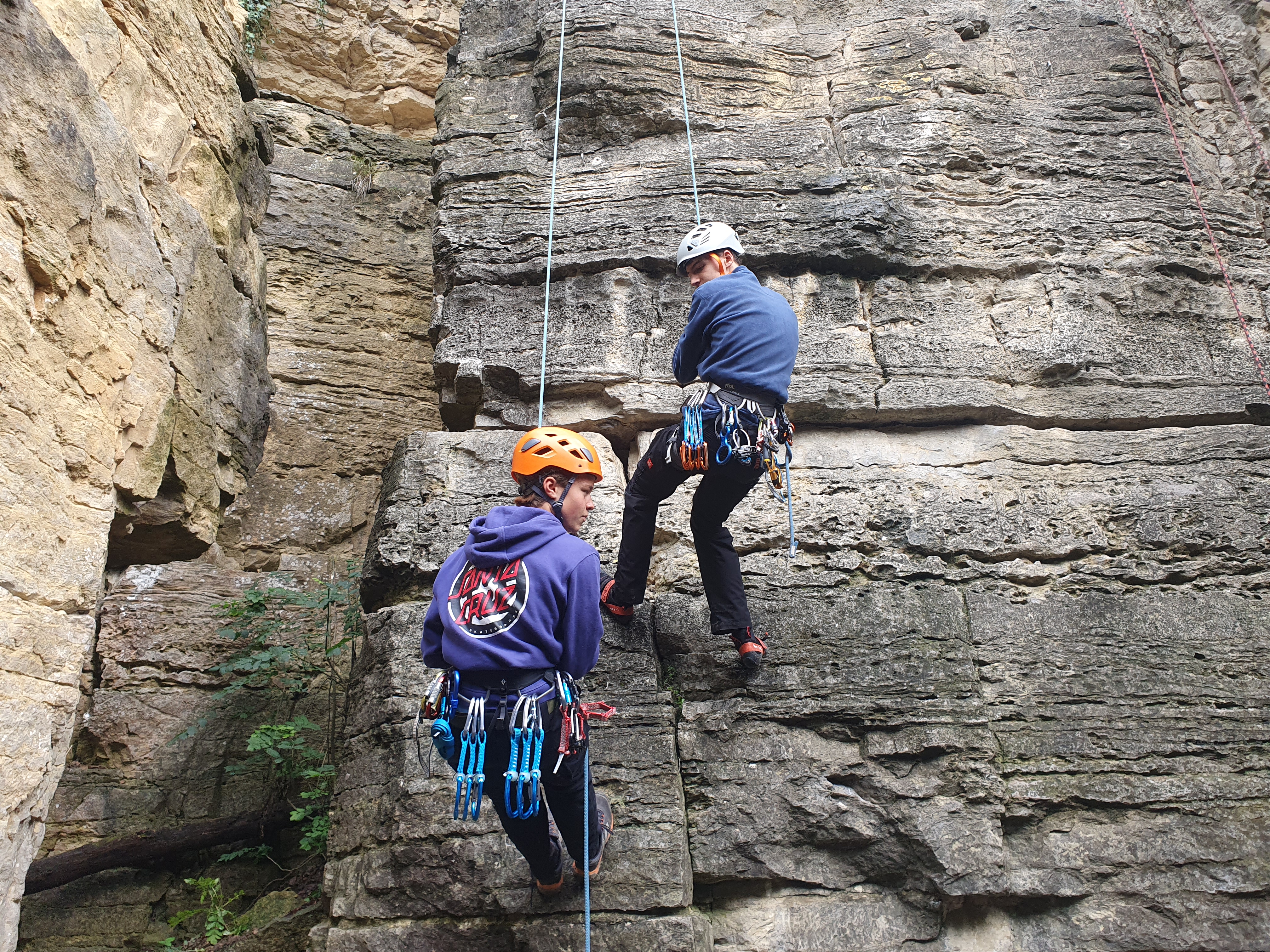 Wir haben uns in verschiedene Gruppen aufgeteilt und zunächst das Klettern am Toprope geübt. Toprope bedeutet, dass ein fixes Seil am höchsten Punkt der Route durch einen Umläufer läuft und die sichernde Person am Boden steht.