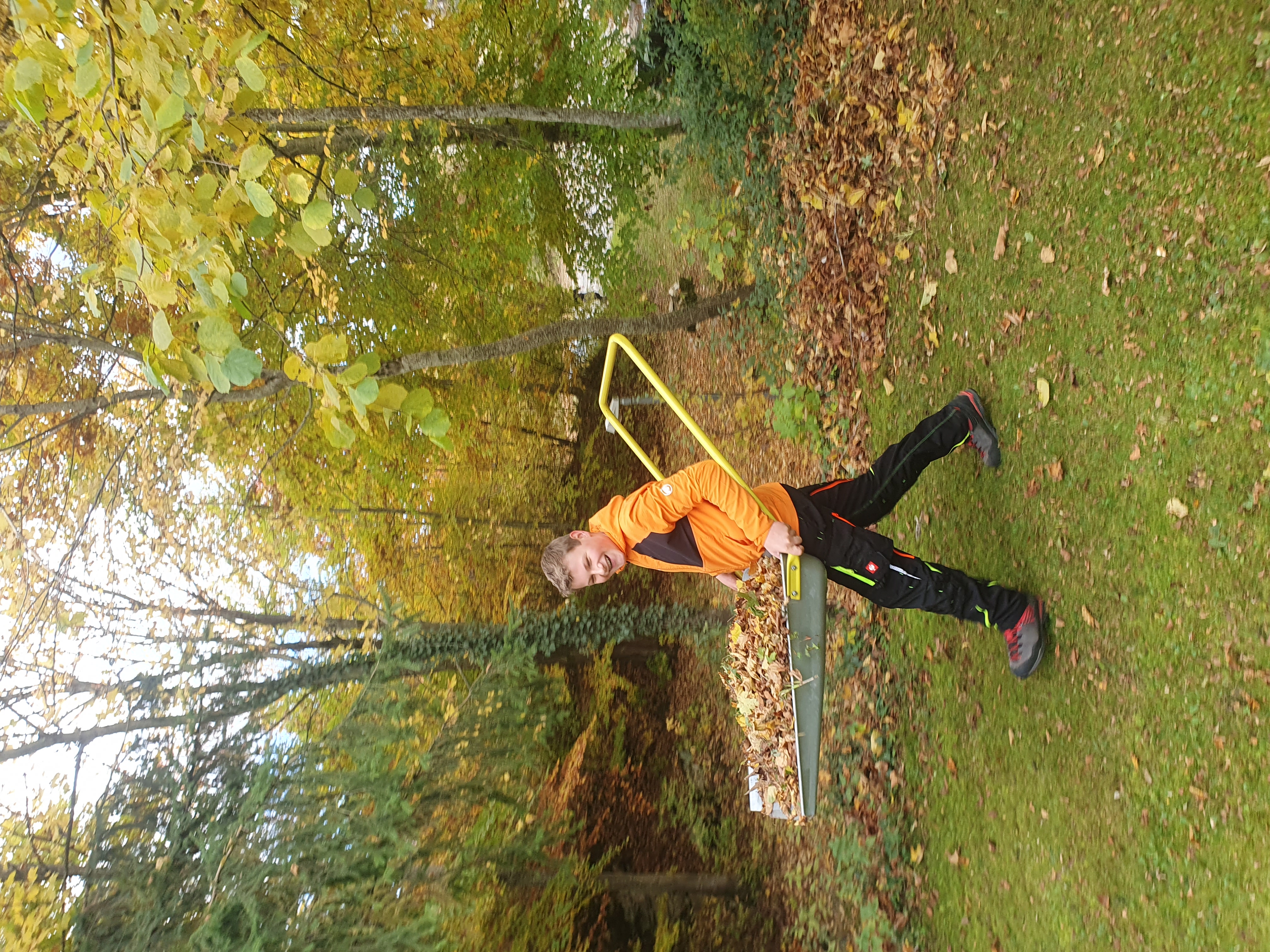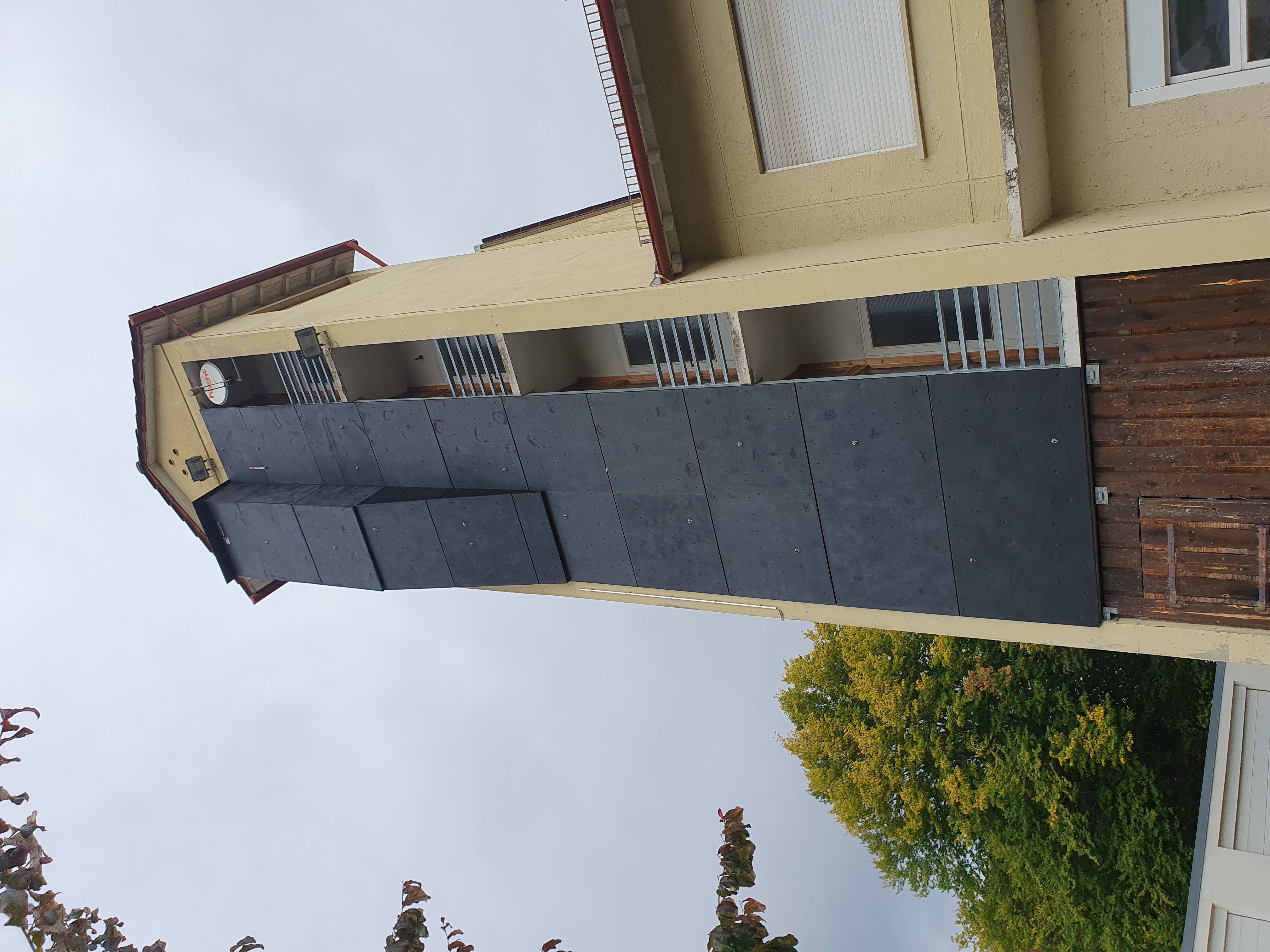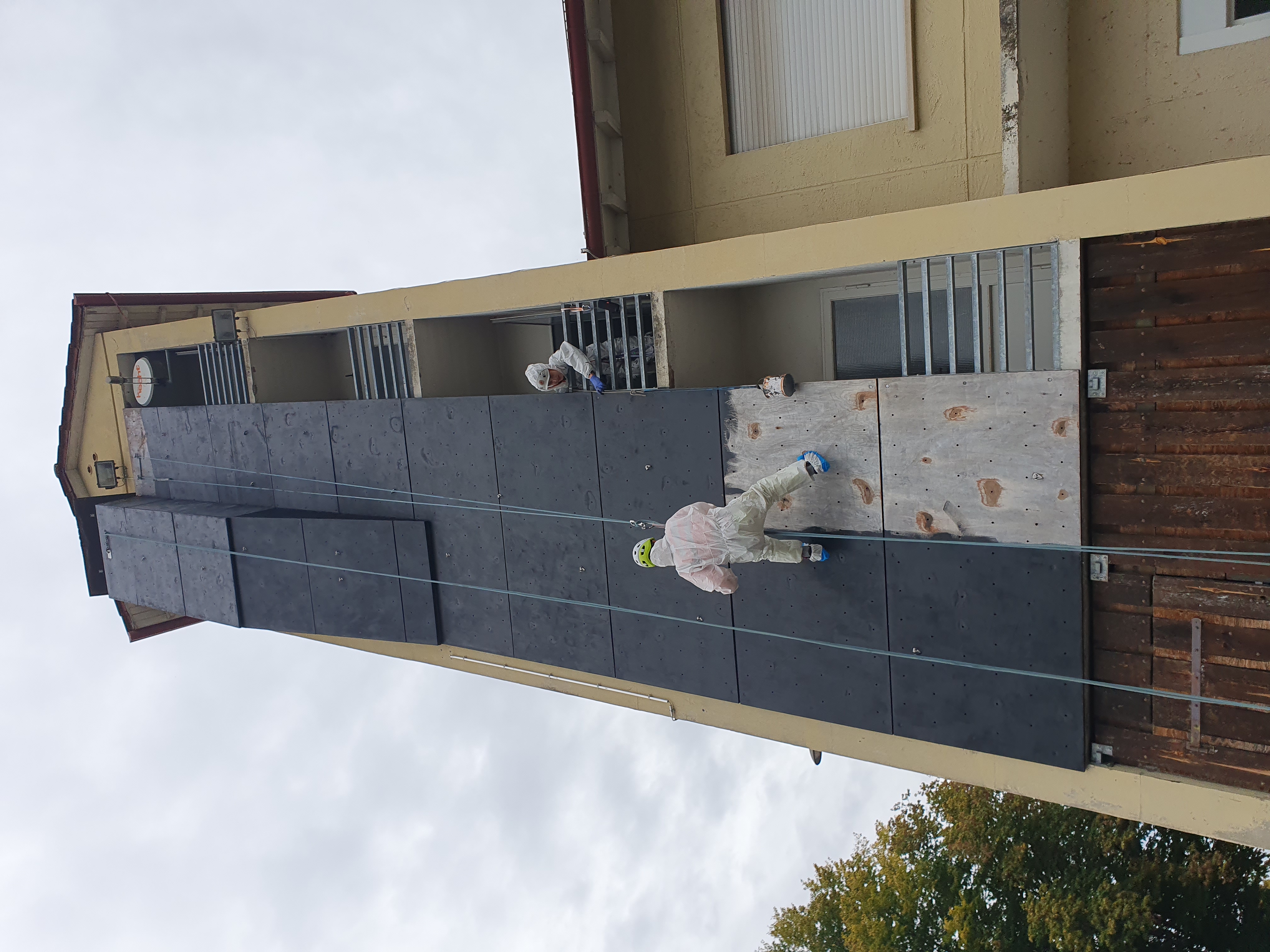 An diesem wunderschönen, warmen Herbsttag haben Lukas, Fabi und Lenny die Kletterwand am Turm abgeschliffen und gestrichen. Die Kletterwand ist 20 m hoch und wurde vor 26 Jahren errichtet.