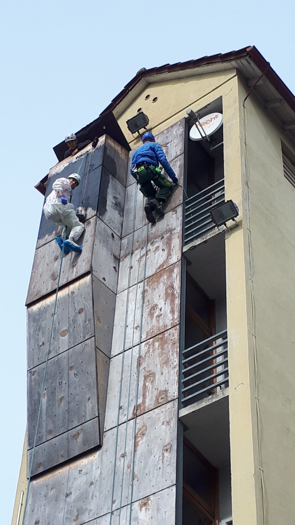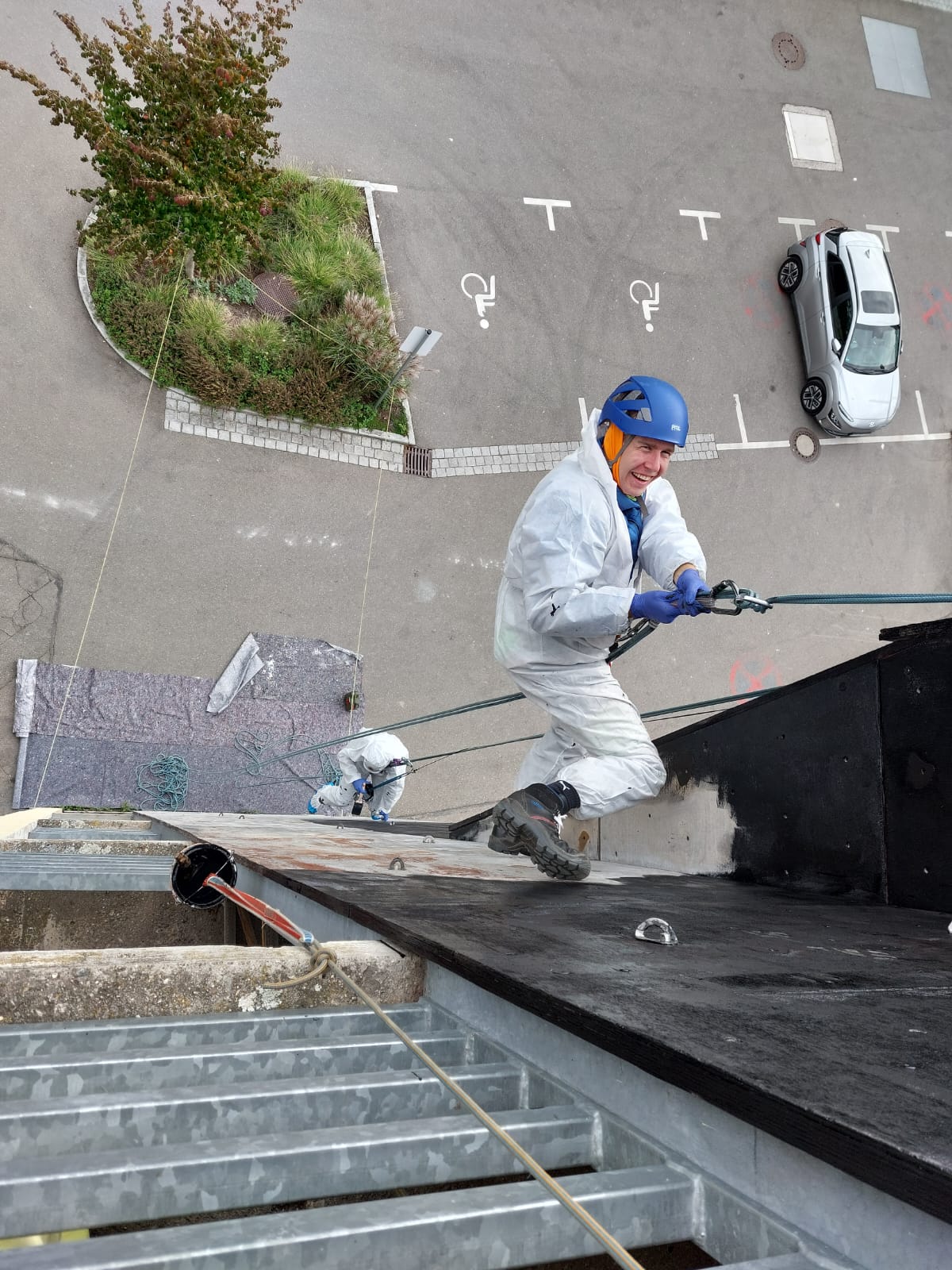 Dabei haben wir uns zunächst Malerüberzüge angezogen und den Asphalt unter der Wand mit Malerfleece ausgelegt. Zum Streichen der Wand haben wir uns an zwei Stellen von der Kletterwand abgeseilt. Die Farbeimer wurden ebenfalls Stück für Stück abgelassen.