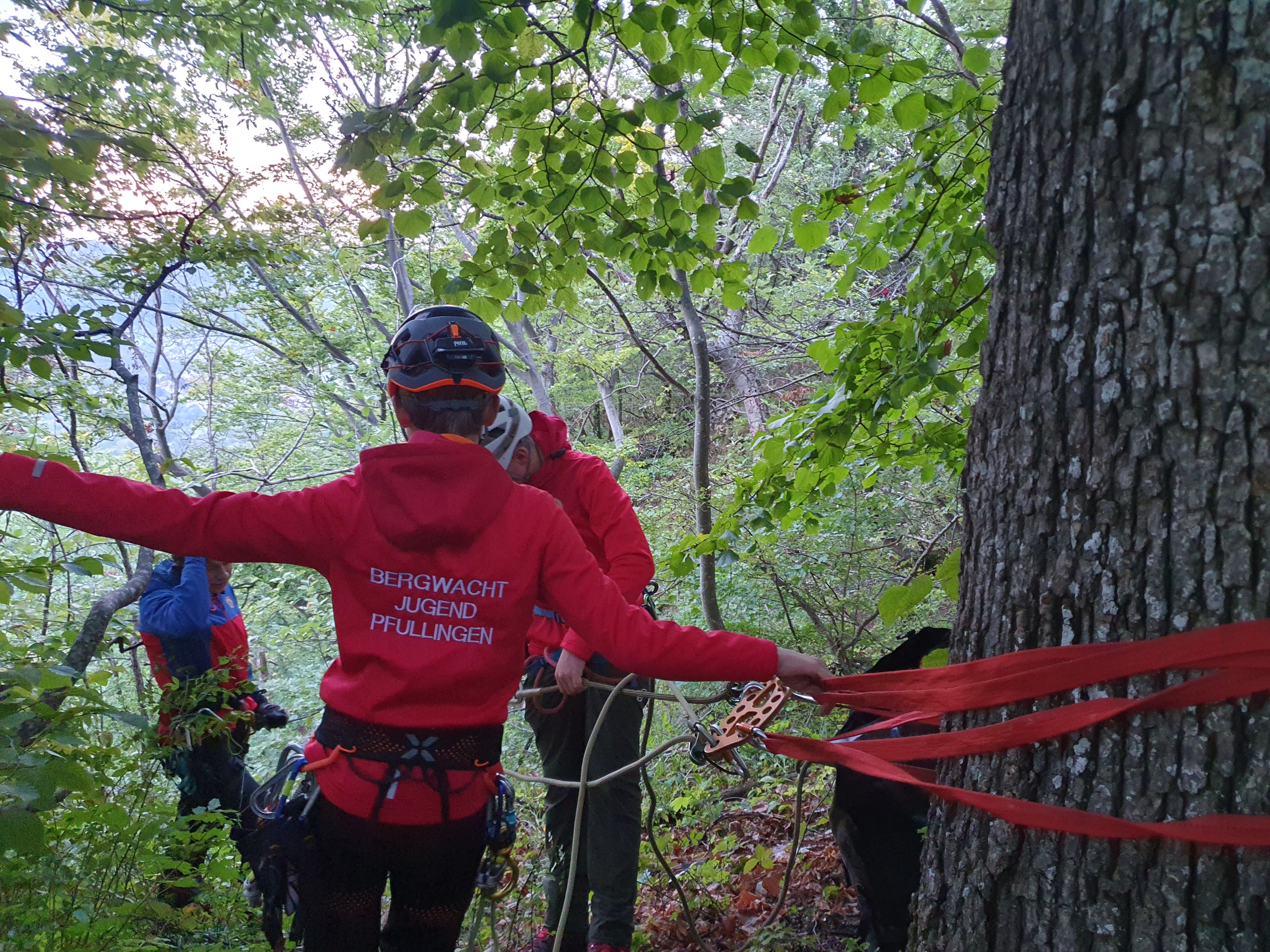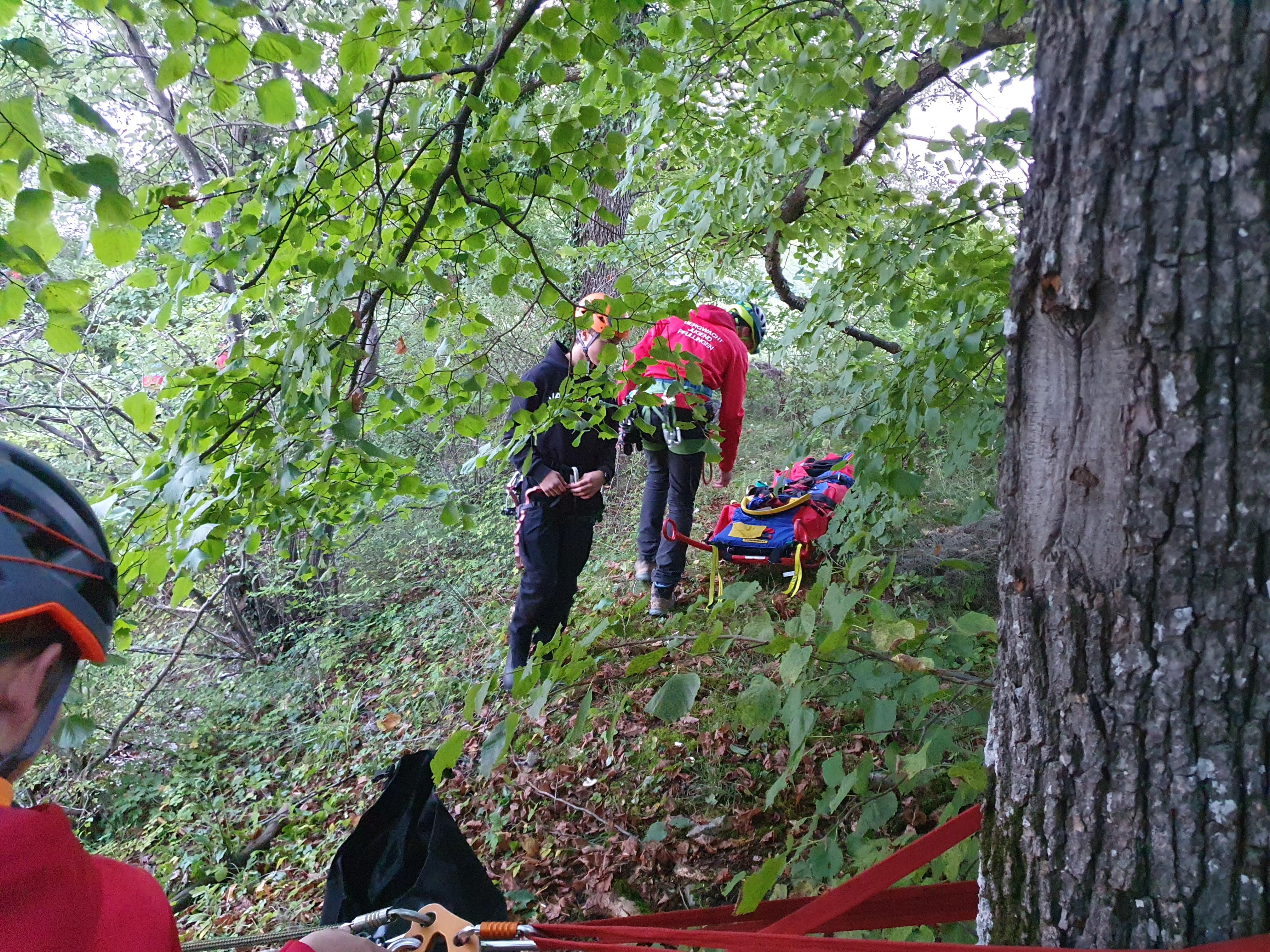 Anschließend wurde eine Person als Patient und ein Retter in das Gelände abgelassen. Der Retter hatte sich zuvor an den zwei 60er Bandschlingen am Fußende der Trage befestigt. Nach dem Umbauen der Bremse und dem Einhängen des Flaschenzuges in die Rigging-Platte am Baum, konnte die Gebirgstrage aufgezogen werden. Dazu wurde die andere Seite des Flaschenzugs mittels zwei TBLOCs in die Statikseile eingehängt. Beim Aufziehen sollten mindestens 3 Personen mitziehen. Außerdem ist darauf zu achten, dass sich der Retter mit seinem gesamten Körpergewicht in den Hang lehnt, um ein sauberes Aufgleiten der Trage zu ermöglichen.