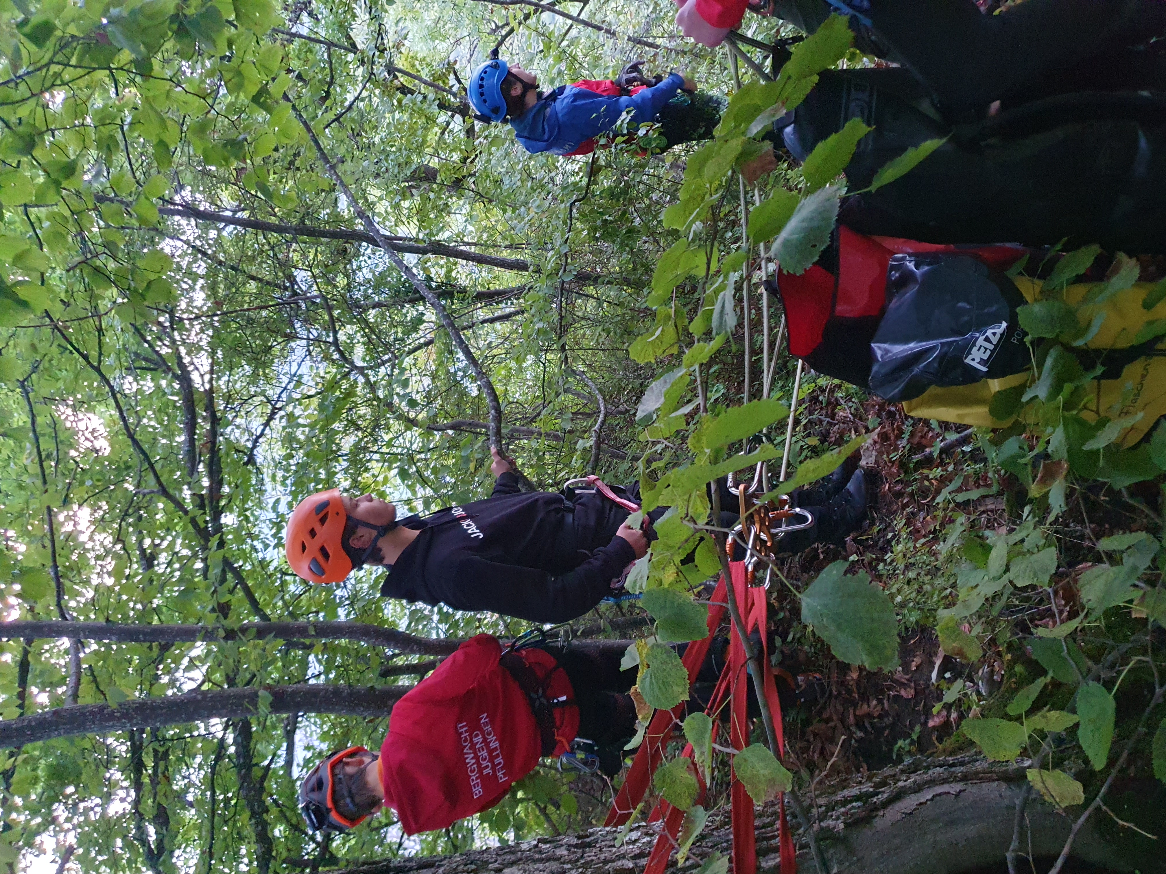 Nach dem Anlegen der Kletterausrüstung, haben wir uns in zwei Gruppen aufgeteilt. Beide Gruppen haben die Bergrettung mit Statikseilen geübt. Dazu wurde als erstes ein Baum ausgewählt, an dem eine Rigging-Platte mit 120er Bandschlingen befestigt wurde. In diese wurden zwei Statikseile jeweils in Tuber (Abseilgerät) eingehängt. Eine zweite Rigging-Platte wurde an der Kopfseite der Gebirgstrage (mit Vakuummatratze und Bergesack) mittels zwei 60er Bandschlingen befestigt. Die zwei Statikseile wurden in die Rigging-Platte an der Trage eingehängt. Um die Trage kontrolliert abzulassen, wurde um die zwei Seilstränge noch ein Prusik als Bremse gelegt.